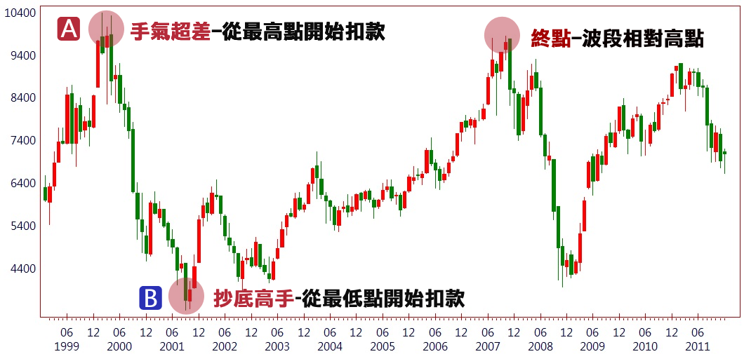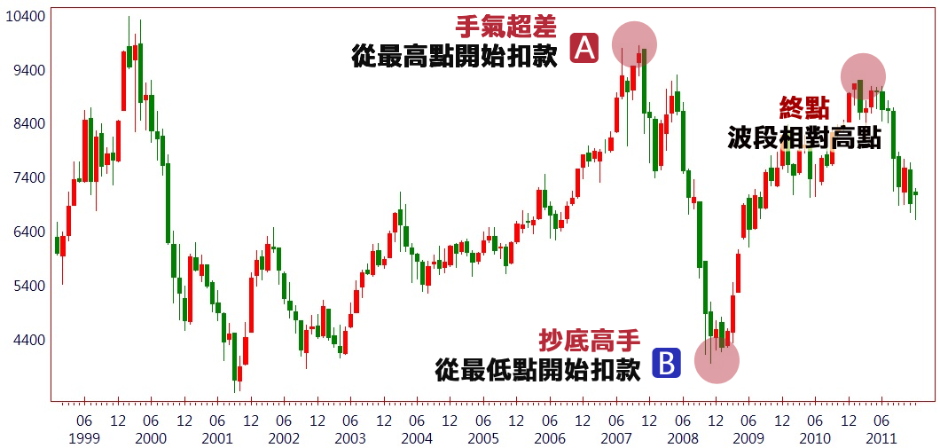 以下定時定額的實測數據,是以台灣加權股價指數為投資標的,並以2000年科技泡沫及2008年金融海嘯兩個波段為例,結果發現精準在底部進場,與很倒楣在高點進場相較,其報酬率居然相差不到5個百分點,而且高點進場因為累積投入的本金比較大,最後實際獲利的金額還比較多!
