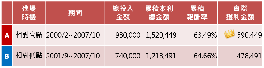 從2000年2月的最高點開始定時定額,雖然一起步就遭遇急跌及負報酬,但在這段期間也多累積了基金的單位數,在經歷完整的微笑曲線下,高點進場的A報酬率,僅較低點進場的B低1個百分點左右,但最後的實際報酬金額,明顯較晚起步的抄底多出許多。