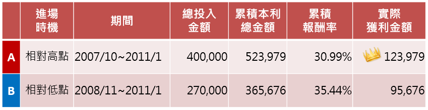 在這波大跌大漲的過程中,就算A從2007年10月的起跌點開始定時定額,因為沒浪費等待低點的時間,在經歷完整的微笑曲線下,A與B的報酬率差距不到5個百分點,實際報酬金額則是多了三成左右。