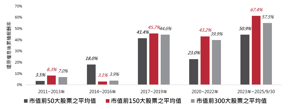 以上資料為舉例說明,不代表未來實際績效。依各期間起始日之上市及上櫃股票市值排名。計算各期間之個別股票報酬率,將市值前50大股票之報酬率加總後,除以50計算平均值;以此類推。資料來源:CMoney、復華投信整理。