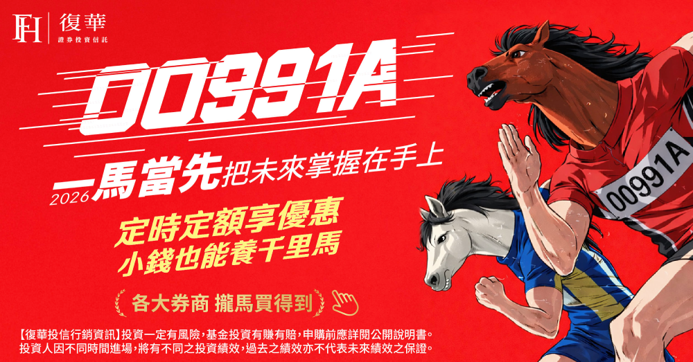 投資一定有風險,基金投資有賺有賠,申購前應詳閱公開說明書(投資人須知)。 個股與相關數據資料僅供說明之用,不代表投資決策之建議。 投資人因不同時間進場,將有不同之投資績效,過去之績效亦不代表未來績效之保證。 本文提及之經濟走勢預測不必然代表本基金之績效,本基金投資風險請詳閱基金公開說明書。 以上資料為舉例說明,不代表未來實際績效。投資人申購本基金係持有基金受益憑證,而非本文提及之投資資產或標的。 投資人申購本基金係持有基金受益憑證,而非本文提及之投資資產或標的。 本基金上市日前(不含當日),經理公司不接受本基金受益權單位數之買回。 本基金經金管會核准或同意生效,惟不表示絕無風險。本公司以往之經理績效不保證基金之最低投資收益;本公司除盡善良管理人之注意義務外,不負責基金之盈虧,亦不保證最低之收益,投資人申購前應詳閱基金公開說明書。本基金自成立日起,即得運用基金進行投資組合佈局,基金投資組合成分價格波動會影響基金淨值表現。投資人於成立日(不含當日)前參與申購所買入之每受益權單位之發行價格,不等同於基金掛牌後之價格,參與申購之投資人需自行承擔基金成立日起至掛牌日止期間之基金淨值波動所產生的風險。本基金受益憑證掛牌後之買賣成交價格應依臺灣證券交易所有關規定辦理。本基金之基金配息不代表基金實際報酬,且過去配息不代表未來配息;基金淨值可能因市場因素而上下波動。本基金配息可能由基金的收益或收益平準金中支付。任何涉及由收益平準金支出的部份,可能導致原始投資金額減損。有關基金應負擔之費用(境外基金含分銷費用)已揭露於基金之公開說明書或投資人須知中,投資人可向本公司及基金之銷售機構索取,或至公開資訊觀測站、境外基金資訊觀測站及本公司網站(https://www.fhtrust.com.tw)中查詢。 復華證券投資信託股份有限公司業已自臺灣證券交易所股份有限公司取得使用臺灣證券交易所發行量加權股價報酬指數或其簡稱發行量加權股價報酬指數之授權。