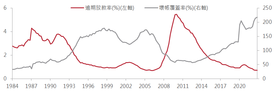 圖二、1984年以來美國銀行逾期放款率及壞帳覆蓋率