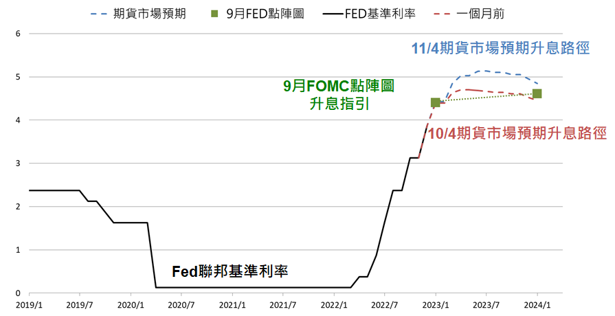 12月FOMC可能上調利率終點,預期市場將持續震盪,市場上調利率終點預期至5~5.25% 。