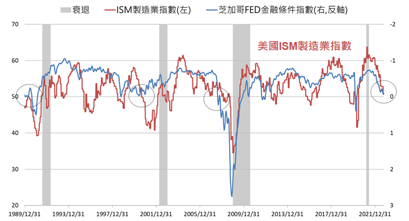 隨金融條件繼續收緊、景氣仍有下行壓力。目前金融條件指數仍低於0,Fed有持續升息壓力。