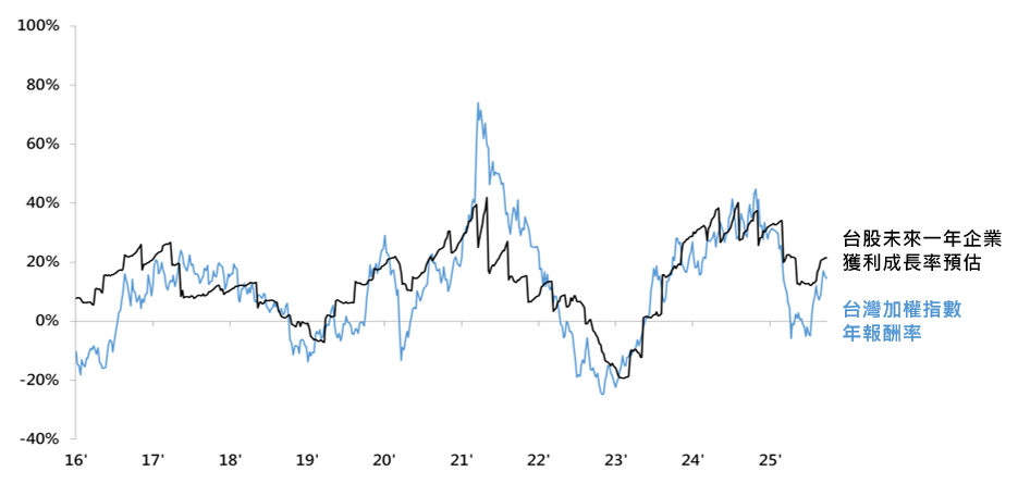 針對台股市場展望,由於AI仍在高速成長、商機龐大,出口強勁並推升2025年台灣經濟成長率,而2026年雖然基期墊高,但有望受惠民間消費而溫和成長。