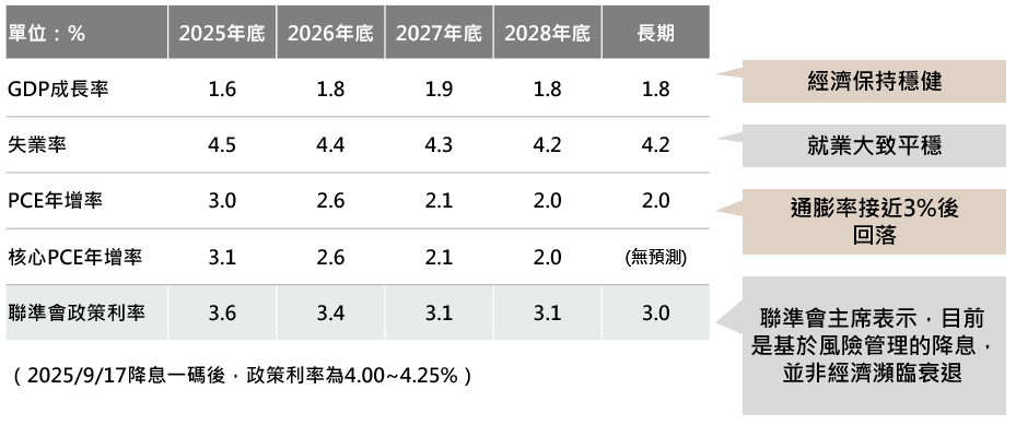 以上資料為舉例說明,不代表未來實際績效。個人消費支出物價指數(PCE)為聯準會關注的通膨指標;核心PCE為排除價格波動度較大的能源與食品項目。本文所稱之通膨率為PCE年增率。資料來源:2025/9/17之FOMC會議。
