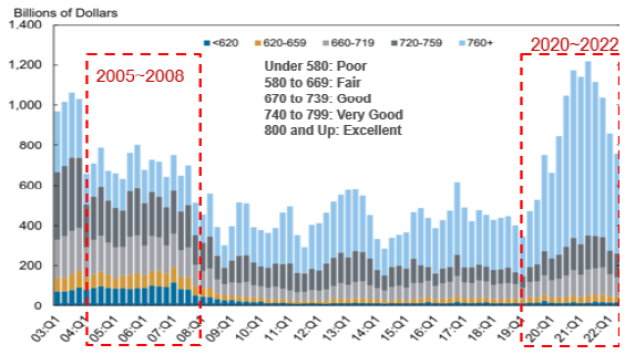 以美國房貸金額及信用分數來看,2007年次貸風暴前,信用分數在720分以上者僅五成,2022Q2則有約八成,顯示信貸品質仍佳,債務風險低。