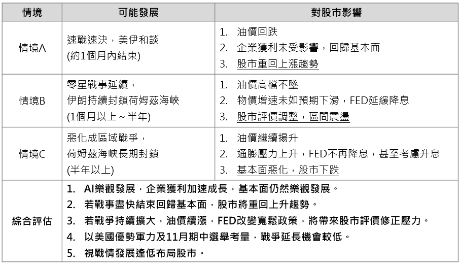 短期股市走勢決定於美、伊戰事發展,若美、伊戰事能在一個月內左右結束、速戰速決,股市短期修正後即可望回歸基本面。