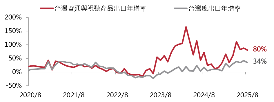 在AI需求推動下,台灣出口動能持續強勁。2025年8月出口年增率達34%,其中資通與視聽產品表現尤為突出,反映AI資料中心與高階晶片需求暢旺(圖二)。受此帶動,主計總處上修台灣全年出口與經濟成長率,預估2025年GDP可達4.45%。
