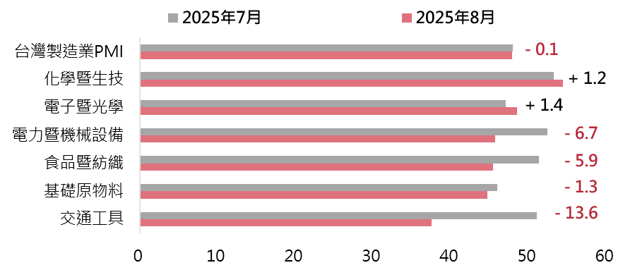 然而,復甦並非全面擴散。8月製造業PMI為47.9,仍低於50的榮枯線,顯示整體製造業仍較疲弱。六大產業中,除電子光學與化學生技仍具支撐外,傳統機械、原物料與交通等產業則呈現明顯下滑(圖三)。顯示台灣出口成長高度仰賴AI與半導體產業,多數傳產復甦力道仍顯不足,投資人需留意經濟結構的不均衡。