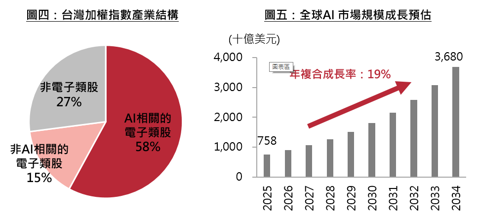 台灣加權指數高度集中於電子產業,其中電子類股市值占比超過七成,而與 AI 相關的權值股更是指數的核心。例如,台積電、鴻海、聯發科、廣達與日月光等企業,皆為 AI 全球供應鏈的重要成員,估算AI相關類股,合計市值權重已約台股加權指數的58%(圖四)。這代表台股走勢與 AI 發展趨勢高度連動,AI 已成為推動台股長線行情的關鍵力量。