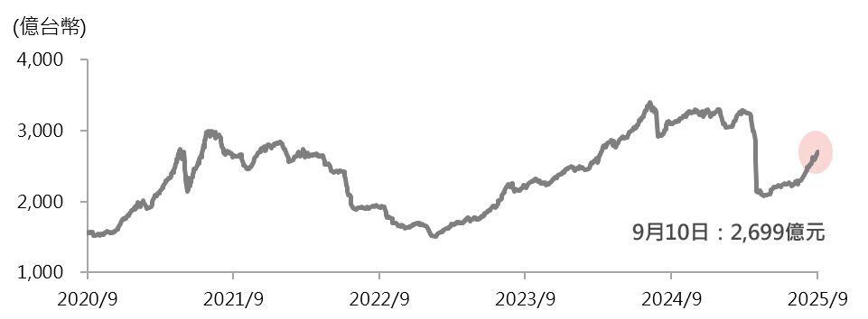 截至2025年9月10日,台灣加權指數的整體本益比約為20倍,位於近五年區間(9-26倍)的偏高位置(圖六),其中電子類股的本益比為22倍,顯示市場對AI的成長性已有高度預期,倘若後續企業獲利前景不如預期樂觀,股價可能因評價壓力而出現震盪;籌碼面部分,台股上市融資餘額約新台幣2,699億元,雖較2024年底略低,但已較今年4月份低點回升約29%,且處於近五年偏高水準(圖七),顯示散戶參與度依舊積極。短線資金氛圍偏熱,使得市場在利多驅動時上漲速度加快,但同時也增加了情勢變動時的波動風險。