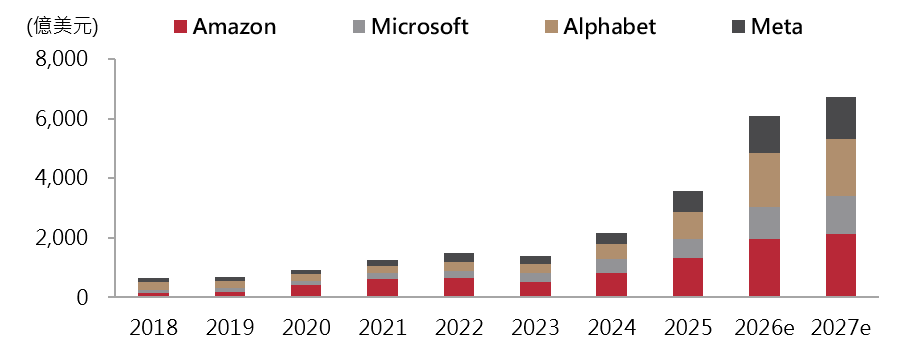 儘管軟體股估值修正,但基礎設施投入未減。預估至2027財年,美國四大雲端服務供應商(CSP)的資本支出合計將突破 6,700億美元(圖二),這為硬體供應鏈提供了支撐。