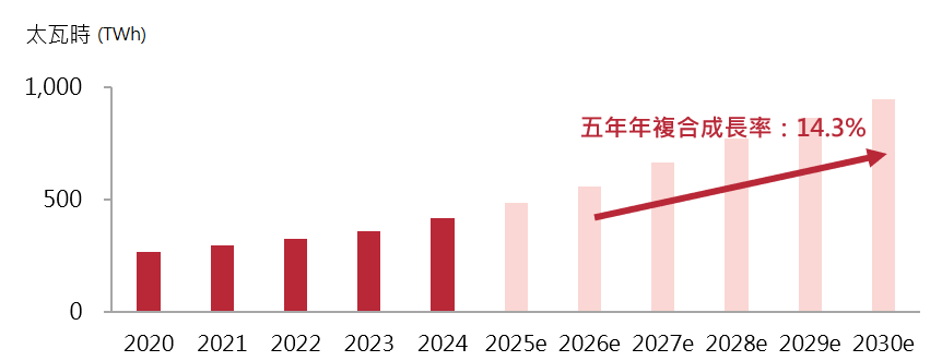 註1:2025~2030年為IEA估計值。註2:太瓦時(Terawatt-hour, TWh)為衡量能量的單位,1太瓦時=10億度電。