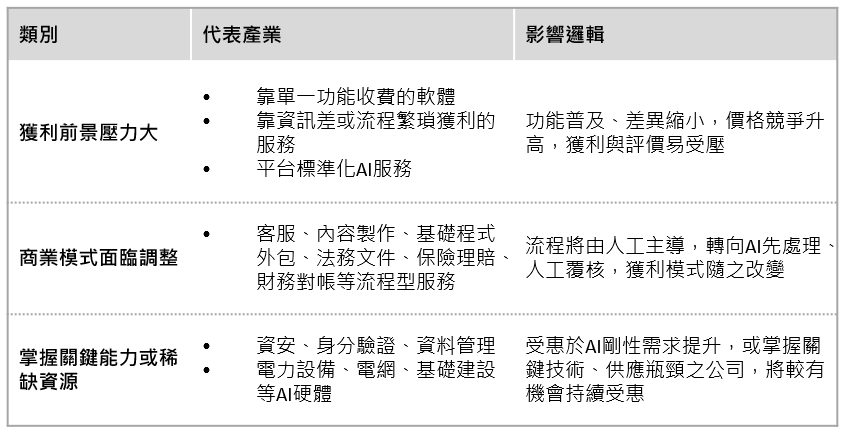 進一步從產業環節觀察,AI帶來的影響並不一致,不同商業模式與供應鏈位置,未來所面臨的機會與壓力將明顯分化(表一)。