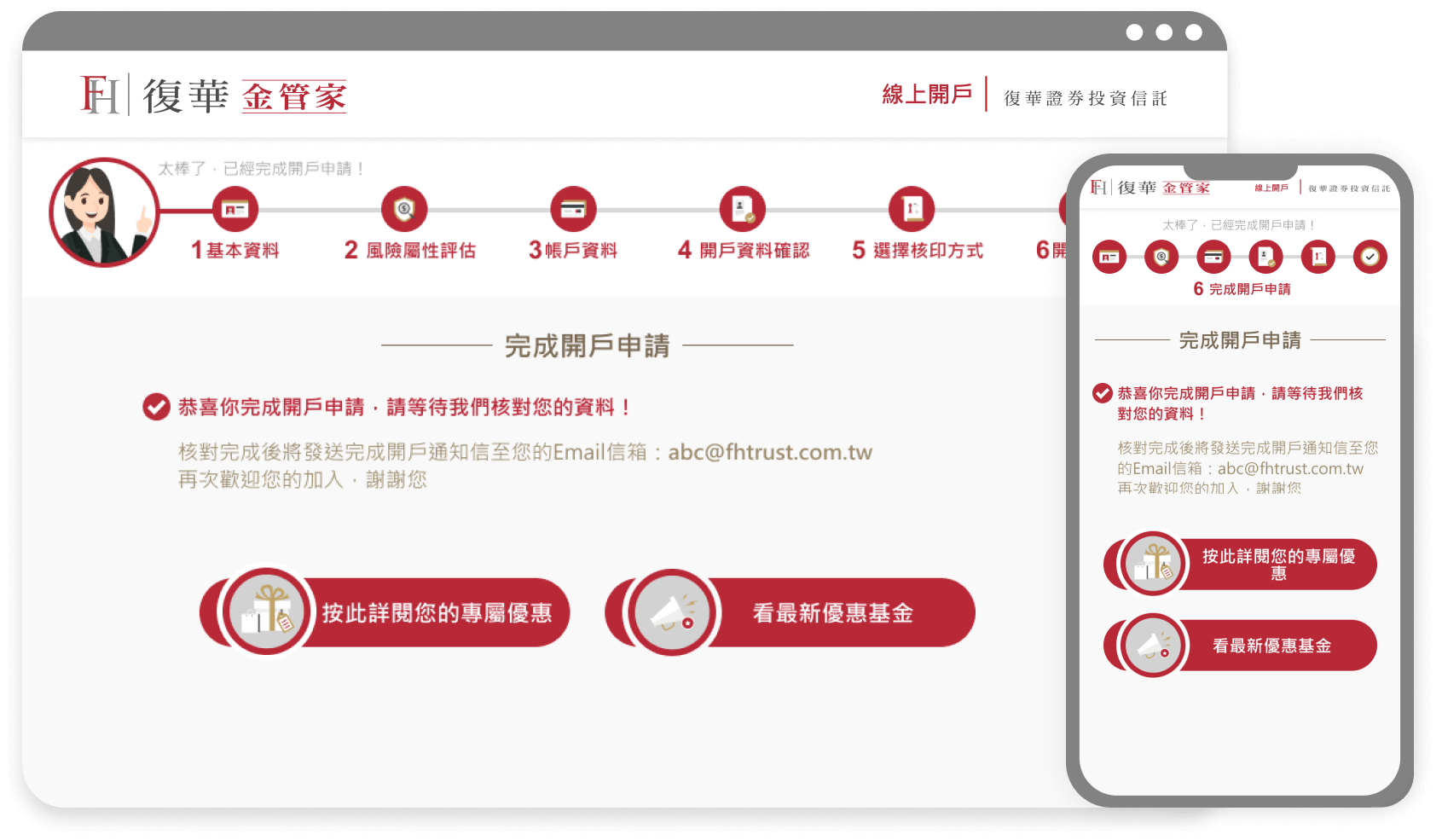 確認閲讀完畢「開戶條款確認」。填寫「個人基本資料」、「風險屬性評估表」與「基金適合度評估表 」→ 點選「下一步」。